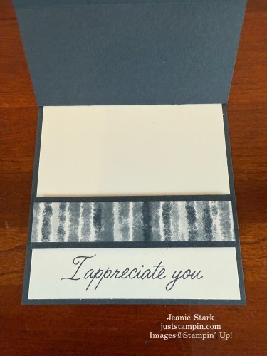 4. Layer 4 x 3/4 strip of DSP to 1 x 4 cardstock. Adhere panel on the inside of the card (above the sentiment) with Dimensionals.